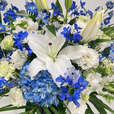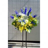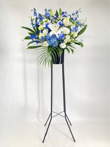 ブルー系のお花を使用しておまかせでお作りします。 こちらはフローリストおまかせ商品ですので、 花材とテイストのご指定はお受けできません。 新たな門出となる開店を華やかにお祝いする、 スタンド型のアレンジメントです。