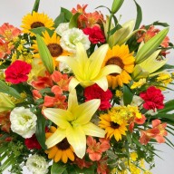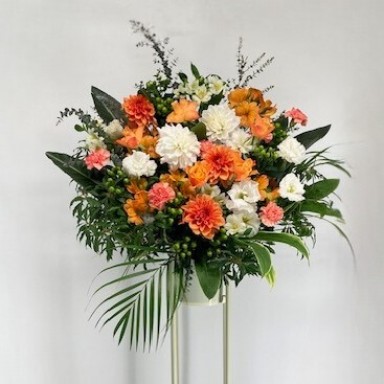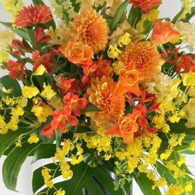 オレンジ系のお花を使用しておまかせでお作りします。 こちらはフローリストおまかせ商品ですので、 花材とテイストのご指定はお受けできません。 鮮やかなオレンジと黄色がよく映える華やかなアレンジメントです。 新たな門出となる開店を華やかにお祝いする、スタンド型のアレンジメントです。