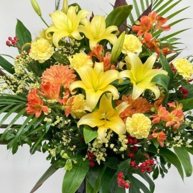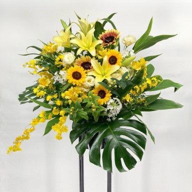 イエロー系のお花を使用しておまかせでお作りします。 こちらはフローリストおまかせ商品ですので、 花材とテイストのご指定はお受けできません。 華やかなイエロー系のお花で作った、スタンド花です。 グリーンを入れることで爽やかに仕上げました。 新たな門出となる開店を華やかにお祝いする、 スタンド型のアレンジメントで式典などの広い会場でも存在感は抜群です。 開店・開業祝い、移転祝いなどのお祝いをゴージャスに演出します。