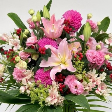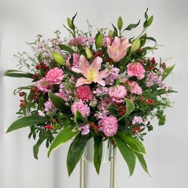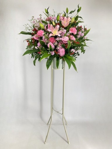 ピンク系のお花を使用しておまかせでお作りします。 こちらはフローリストおまかせ商品ですので、 花材とテイストのご指定はお受けできません。 新たな門出となる開店を華やかにお祝いする、スタンド花です。 優しさや愛情を感じさせる可愛らしいピンク系のお色でお作りします。 高さがあり、ボリュームのあるスタンド花でも圧迫感がなく優しい印象に仕上がります。 大切なビジネスシーンで、豪華にお祝いを盛り立ててくれますよ。