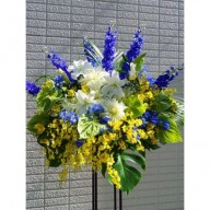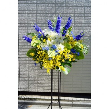 黄色とブルーで爽やかな色合いでまとめたスタンド花です。たっぷりと入れた黄色の蘭に鮮やかなブルーが映えます。黄色は明るい未来や前向きな気持ちを表す色...