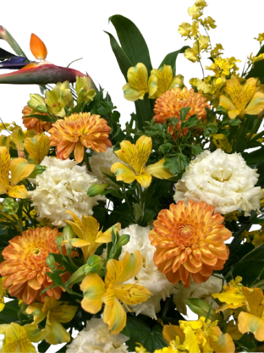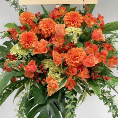 オレンジ系のお花を使用しておまかせでお作りします。 こちらはフローリストおまかせ商品ですので、 花材とテイストのご指定はお受けできません。 鮮やかなオレンジと黄色がよく映える華やかな色味で、 新たな門出となる開店を華やかにお祝いする、 スタンド型のアレンジメントです。